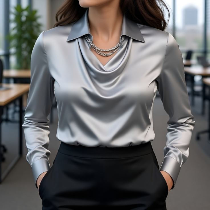 قميص نسائي بسيط بأكمام طويلة وياقة منحنية مع ثنيات